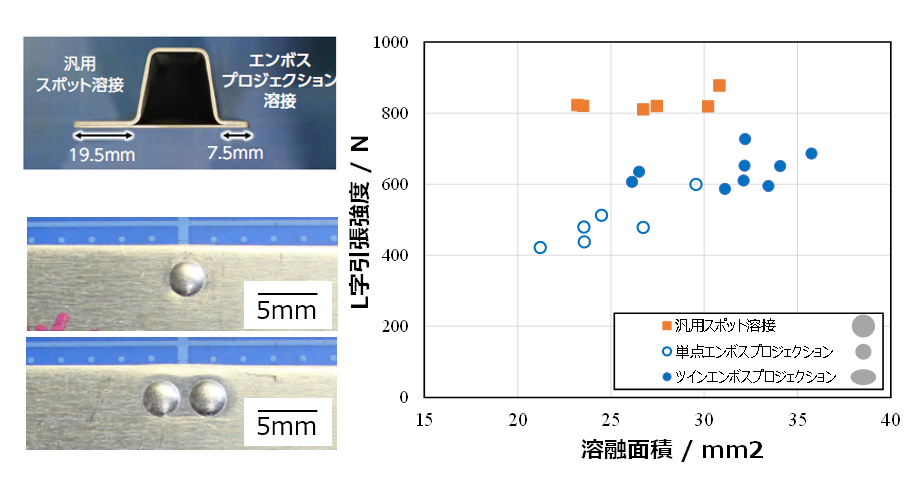 •エンボス形状を工夫(小径化、複数配置)すれば従来の抵抗スポット溶接では実現出来ない狭幅フランジ部溶接にも適用可能。