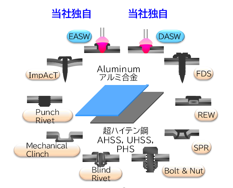 •自動車用途で実用化されている異種材金属接合技術の多くは機械締結(SPR,FDSが主流)。