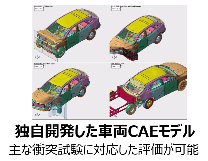 自動車車体全体の衝突性能評価技術・CAE技術を開発し、衝突安全性向上、車体軽量化によるCO2削減に貢献。車両衝突時の入力や変形を模擬した単品構造の衝突性能評価も可能。