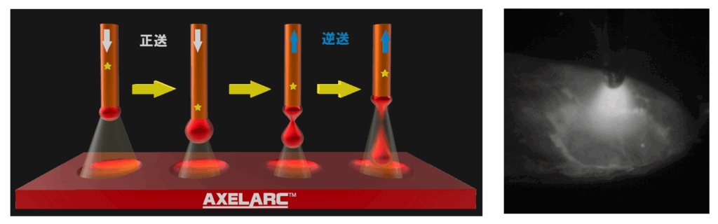 AXELARCTMはワイヤの正送・逆送動作によって、溶滴移行に慣性を付与し、規則的なドロップ移行を実現する。