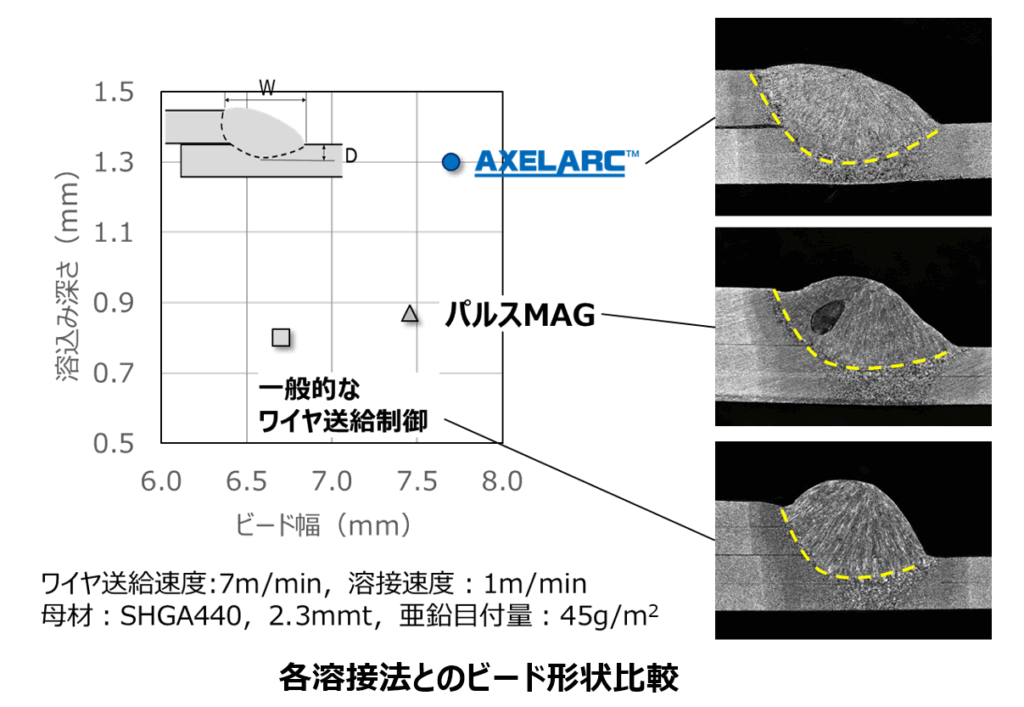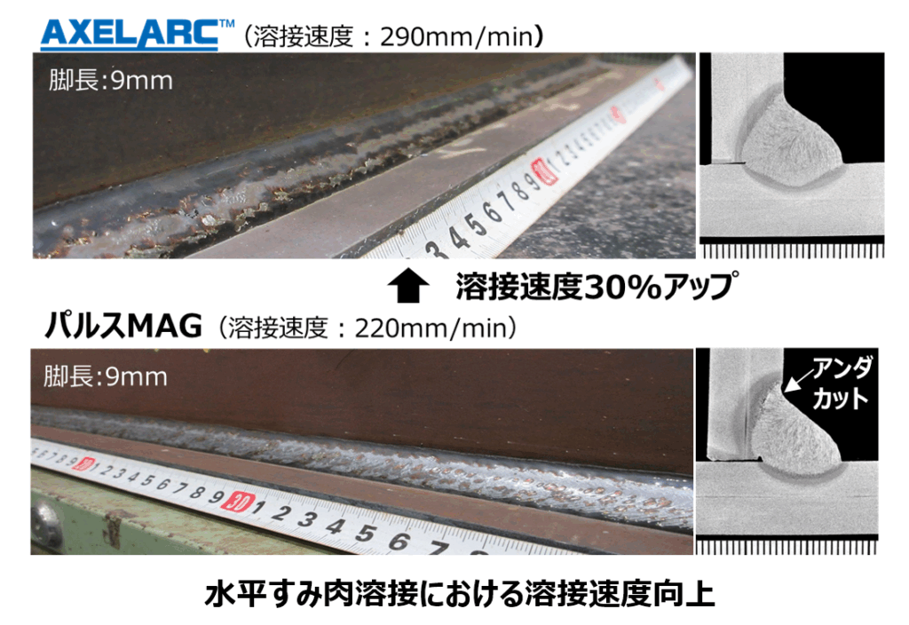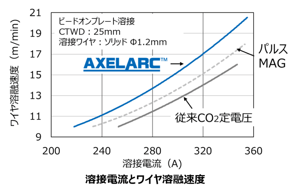 従来溶接法と比較し、同じ電流においてワイヤが良く溶けるため、溶接速度の向上や積層数の低減など能率向上が可能である。