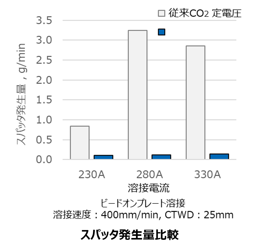 従来の炭酸ガスの常識を超える極低スパッタを実現し、広い溶接条件範囲で、スパッタ発生量は従来の1/10程度となる。